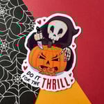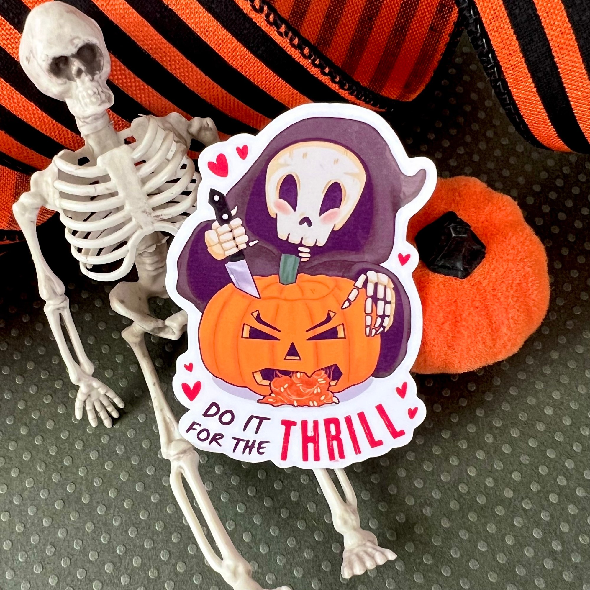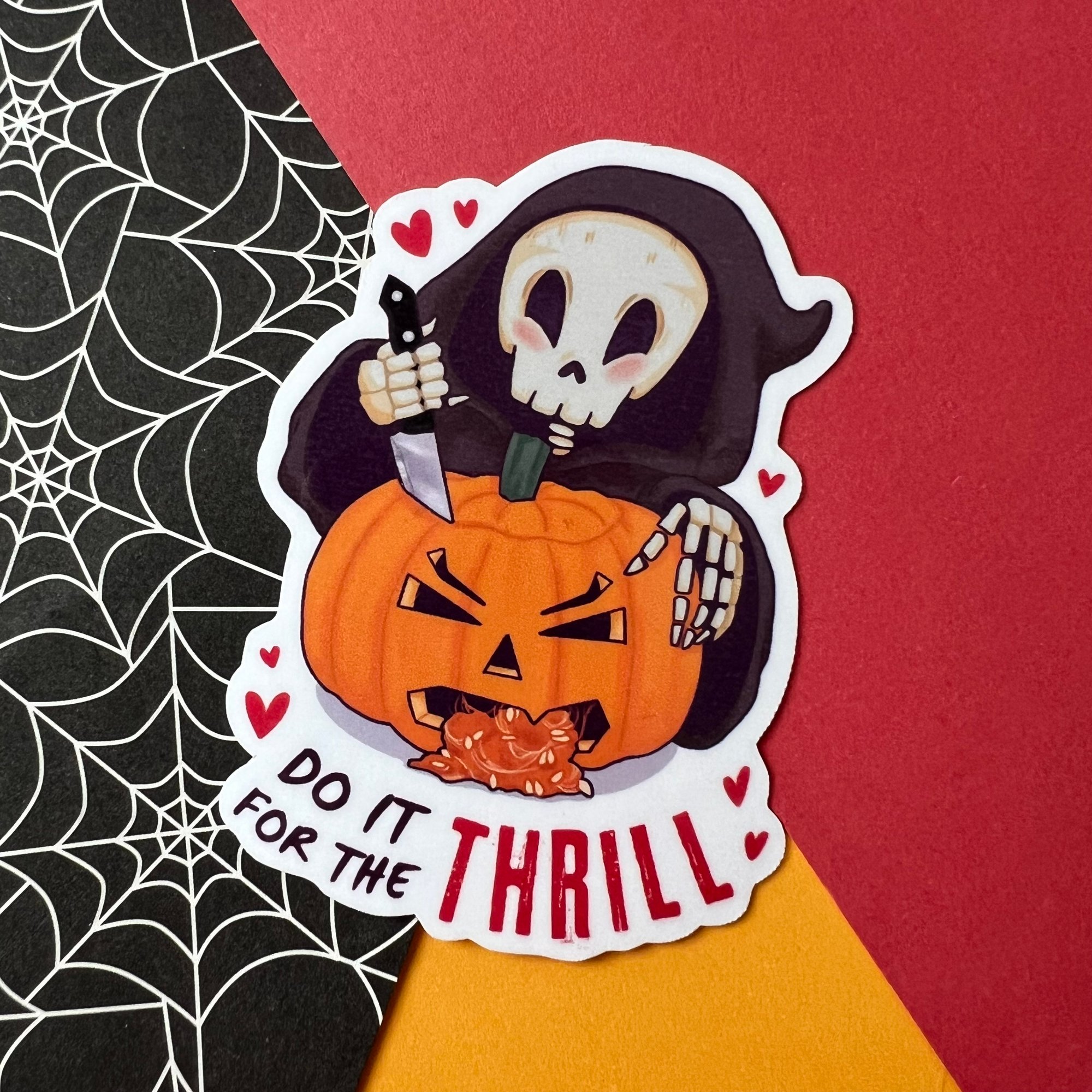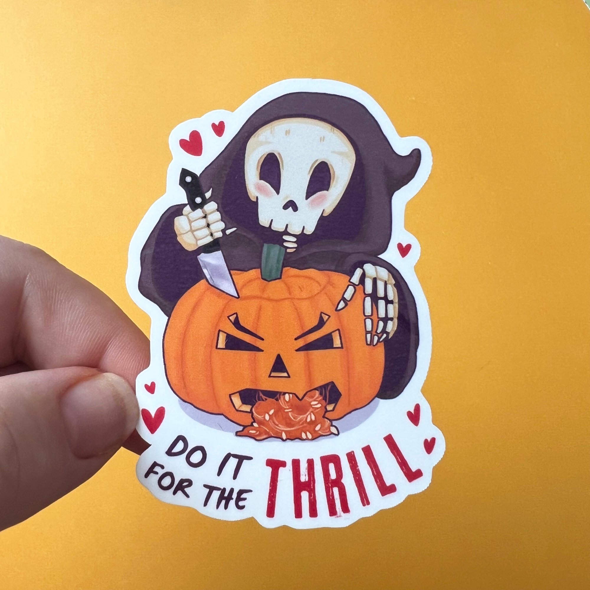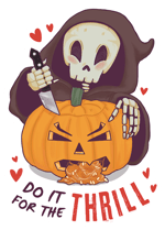 The Grim Reaper goes full slasher, carving a pumpkin that loses its guts. ‘Do It for a Thrill’ is creepy cute fun for the halloween season.
